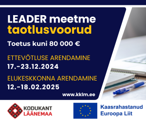MTÜ Kodukant Läänemaa alustab LEADER meetme projektitaotluste vastuvõtmist ettevõtluse arendamise meetmes. Ettevõtluse arendamise (Meede 1) taotlusvoor on avatud 17.-23.12.2024 (taotluste vastuvõtt lõpeb kell 16 viimasel taotluspäeval), meetmemaht on 399 094 eurot.