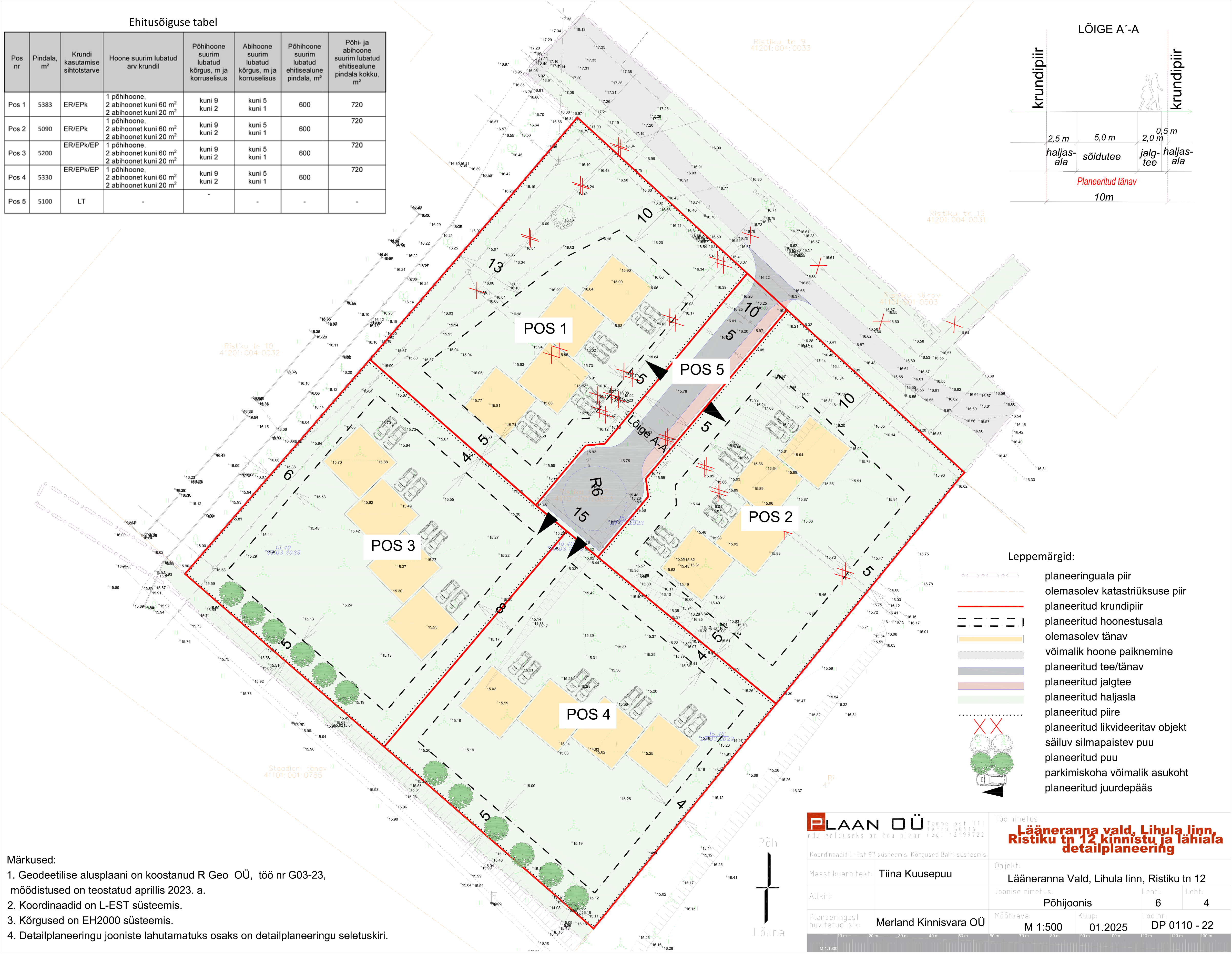 Planeeritava ala suurus on 1,3 ha. Detailplaneeringu eesmärk on Ristiku tn 12 katastriüksuse (tunnus 41101:001:0853, pindala 1,1 ha, sihtotstarve elamumaa) jagamine ja ehitusõiguse määramine 4 kuni 4-kohalise ridaelamu ehitamiseks. Elamukrundi suurus 2486–2698 m2. Suurim lubatud hoonete arv krundil 5 (1 põhihoone ja 4 abihoonet), ehitisealune pind 720 m2, sh põhihoone 600 m2, mille lubatud kõrgus 9 m maapinnast, abihoone 5 m, korruste arv 2, katusekalle põhihoonel 20–45 kraadi, abihoonel 0–45 kraadi. Juurdepääs on kruntidele kavandatud Ristiku tänavalt uue tupikteega. Krundid ühendatakse Lihula linna ühisveevärgi- ja kanalisatsiooniga ning kaugküttevõrguga.