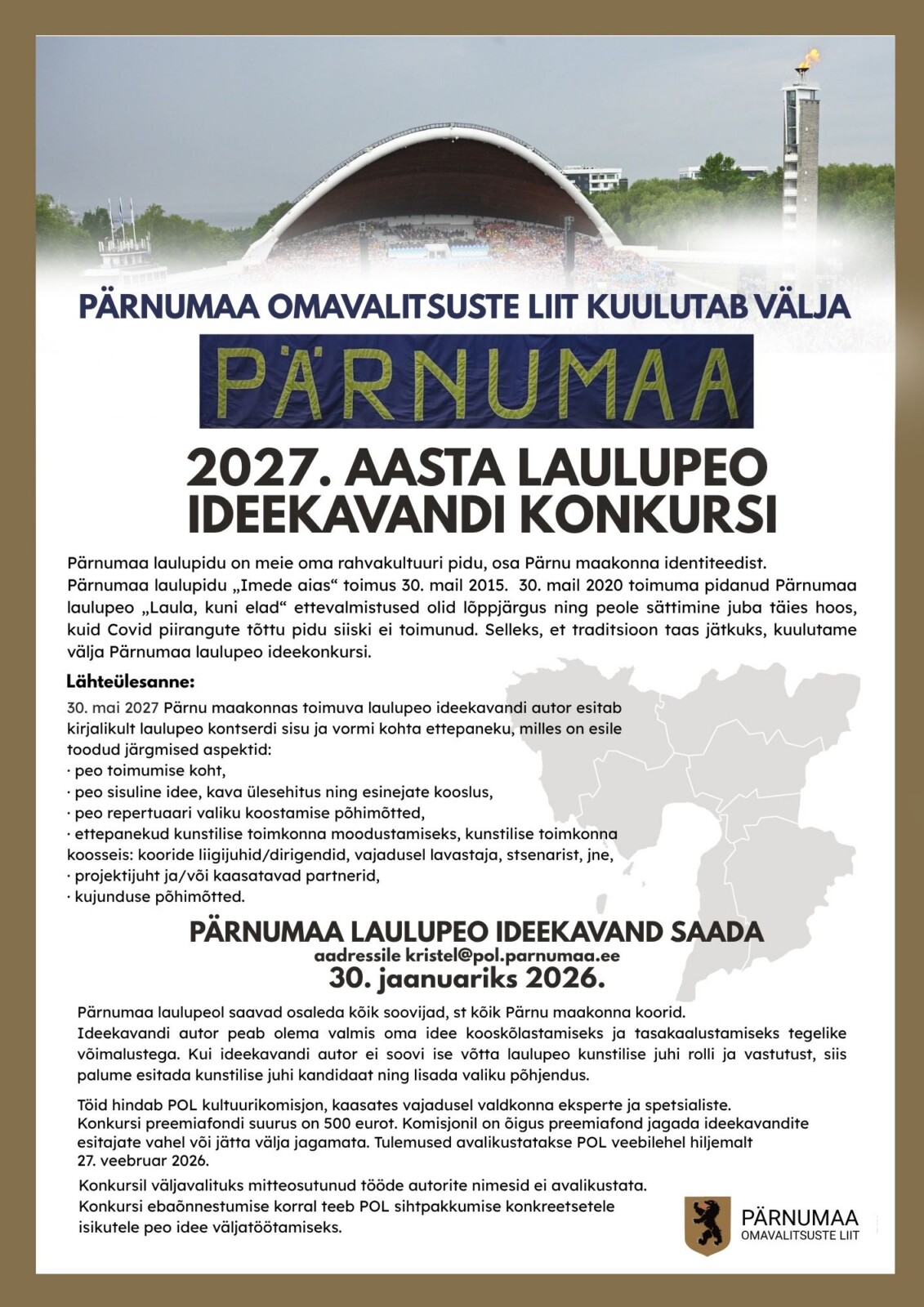 Pärnumaa Omavalitsuste Liit otsib ideid 2027. aasta maakondlikuks laulupeoks ja kuulutas välja 500-eurose preemiafondiga ideekavandi konkursi.