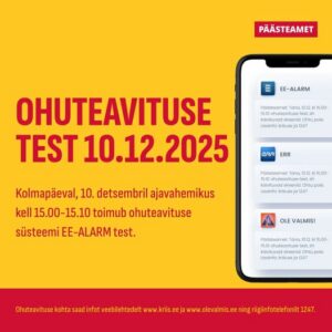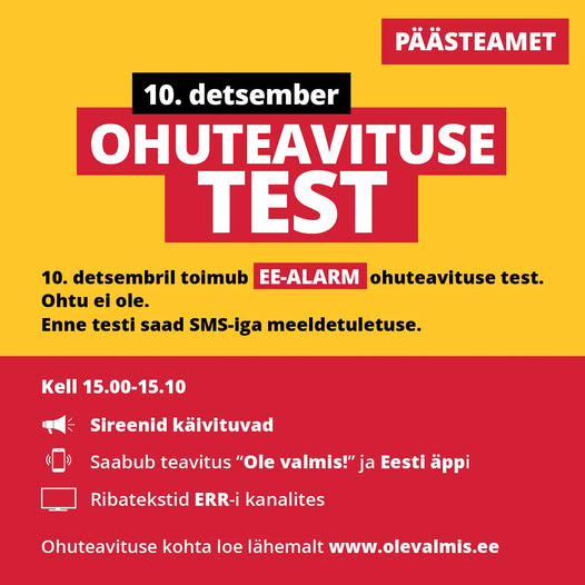 Päästeamet testib kolmapäeval, 10. detsembril EE-ALARM ohuteavituse erinevaid kanaleid, sh käivitatakse sireenid. Tegemist on testiga ja tegelikku ohtu pole.