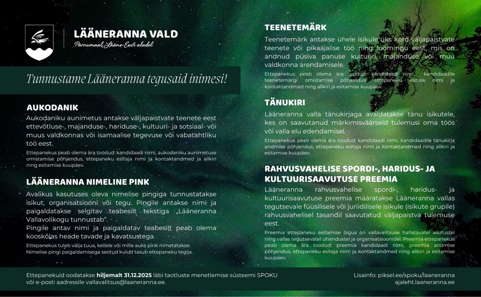 Tunnustusettepanekuid oodatakse 31. detsembrini 2025. Lisainfo: Kutsume märkama ja tunnustama Lääneranna valla tegusaid inimesi