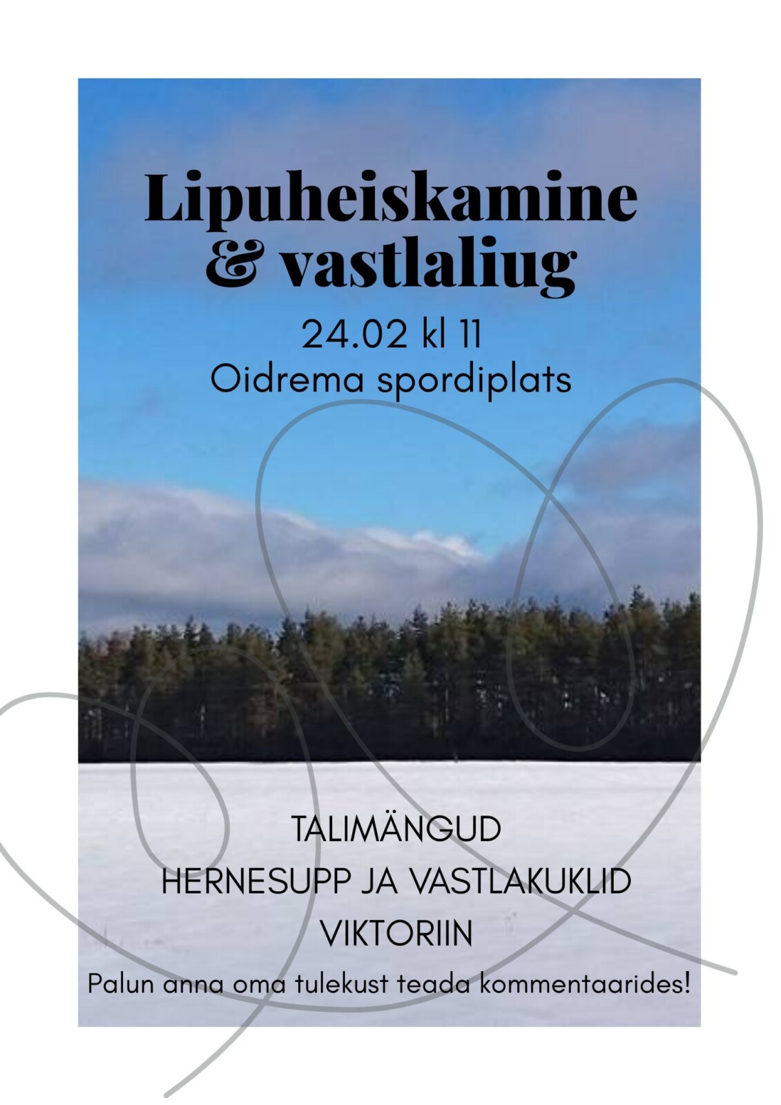 Kell 11 Oidrema spordiplatsil lipuheiskamine & vastlaliug. Aga muidugi saame kokku, et lipuheiskamisega tähistada Eesti Vabariigi sünnipäeva. Ja kui me juba kokku tuleme, siis laseme ikka liugu ka ning soojendame end pärast hernesupiga ja maiustame vastlakuklitega. Ja nagu kombeks saanud, toimub veel viktoriin, nii et pange oma mõtlemismütsid pähe!