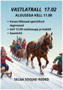 Kell 13.00 Varbla kohviku juures vastlapäev. Saanisõit ja ratsutamine (5 €). Hernesupp, kukild (võimalik ette tellida). Varbla Külaseltsi liikmete lastele üks saanisõit TASUTA! Tule kogu perega vastlapäeva tähistama!