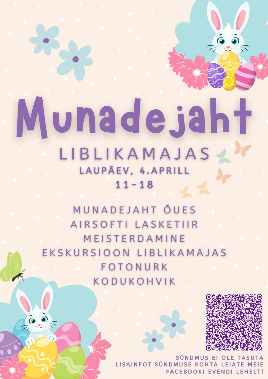 Päeva keskmes on munadejaht, kus lapsed saavad kaardi abil otsida peidetud mune ning leida väikeseid üllatusi. Munadejahi osavõtutasu on 7 eurot.